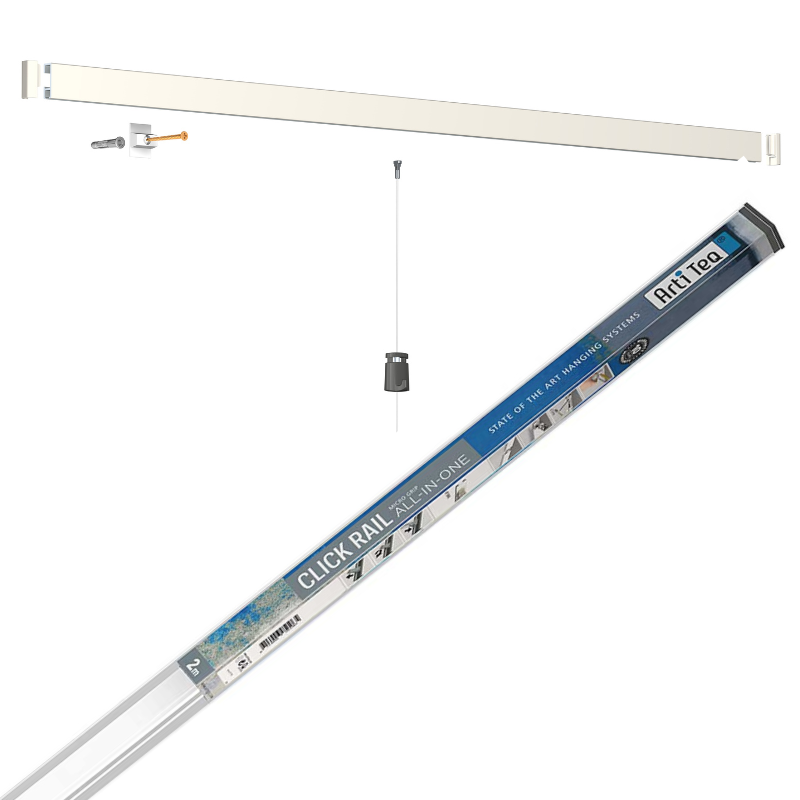 Ce pack 2 mètres cimaise Click Rail couleur Blanc (peut être peint) inclut : 1 rail de 200 cm, 6 click and connect, 6 vis, 6 chevilles, 2 câbles perlon slider de 150cm, 2 crochets Newly H50 et 2 embouts de finition.