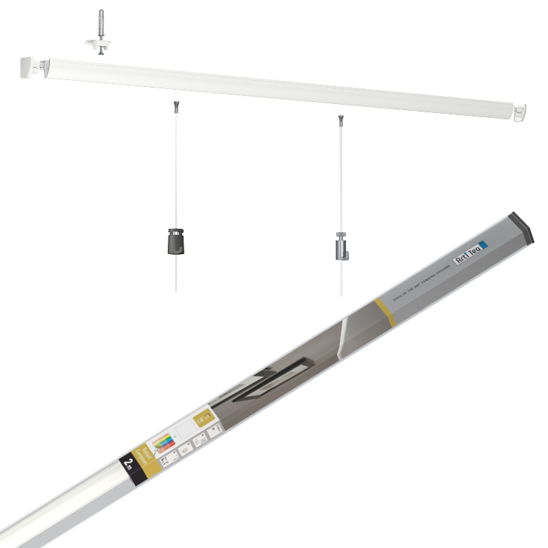 Pack complet 2 mètres de cimaise Up Rail Artiteq de couleur Blanc mat (peut être peint). Cimaises pouvant supporter jusqu'à 20 kg par mètre linéaire.